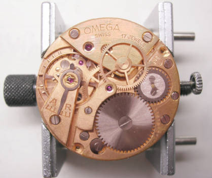 オメガの名機30ミリキャリバーです。 「30ミリ」とはムーブメントの直径が30mmである事に由来し、クロノメーターコンクールの腕時計ムーブメント最大直径が30mmである事に対応しています。当時の腕時計としては革新的な精度であり、クロノメーターコンクールで数々の優秀な成績を収めています。 大きなテンプが特徴の構造で、また、耐久性も良いようで、古い物でも精度良く動作する物が多いムーブメントです。 |