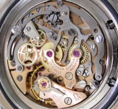 初めて月に行った時計、スピードマスターに搭載されていた伝説のキャリバー321です。コラムホィール式、12時間積算計付きのクロノグラフ。 第2世代のスピードマスターではCal.861となり、カム式になりました。 |